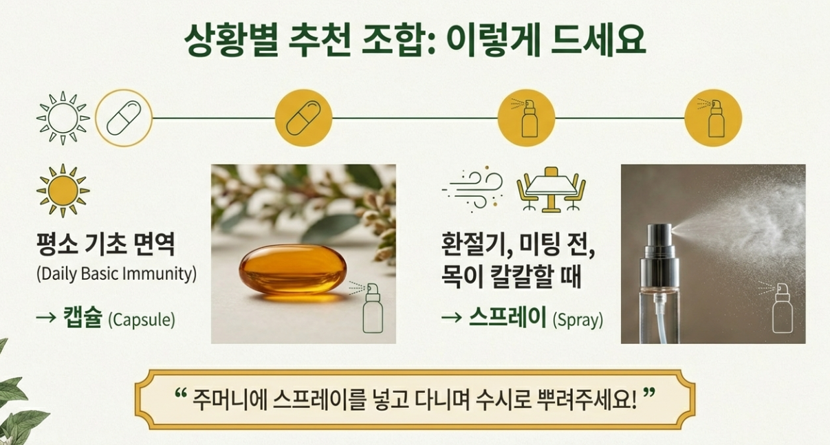가장 간편하고 맛과 향에 민감한 분들에게 적합합니다. 위장에서 녹아 전신 면역 관리에 도움을 주지만, 구강 직접 접촉 효과는 기대하기 어렵습니다.