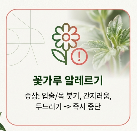 섭취 후 입술이나 목이 붓거나 간지러움, 두드러기가 올라온다면 즉시 섭취를 중단하세요. 또한, 프로폴리스는 혈액 응고를 늦출 수 있으므로 수술을 앞두고 있다면 최소 1~2주 전에는 중단하는 것이 안전합니다.