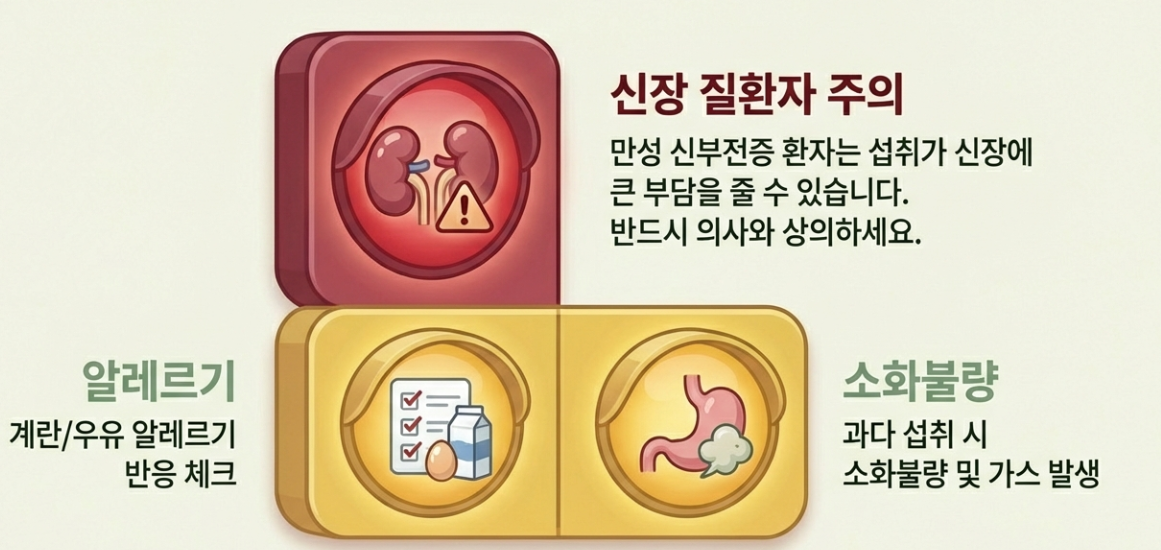 알부민이 몸에 좋다고 해서 무조건 많이 먹는 게 좋을까요? 절대 아닙니다. 단백질 성분이기 때문에 과다 섭취 시 오히려 독이 될 수 있어요.