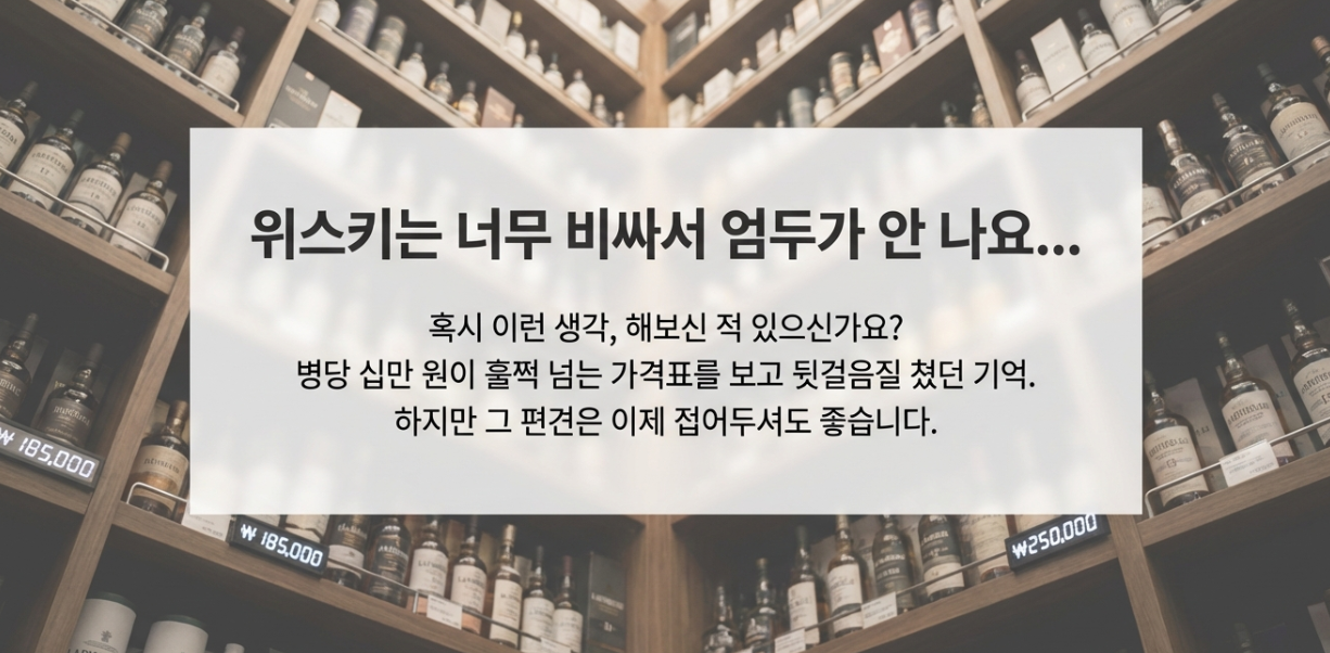 "위스키는 너무 비싸서 엄두가 안 나요..." 혹시 이런 생각 해보신 적 있으신가요? 저도 처음 위스키에 입문할 때, 병당 십만 원이 훌쩍 넘는 가격표를 보고 뒷걸음질 쳤던 기억이 나네요. 하지만 걱정 마세요! 요즘은 마트나 편의점 앱만 잘 활용해도 치킨 두세 마리 값으로 훌륭한 퍼포먼스를 보여주는 보석 같은 위스키들을 만날 수 있답니다. 퇴근 후 나를 위로해 주는 한 잔, 5만원 한 장으로 시작해보는 건 어떨까요? 😊