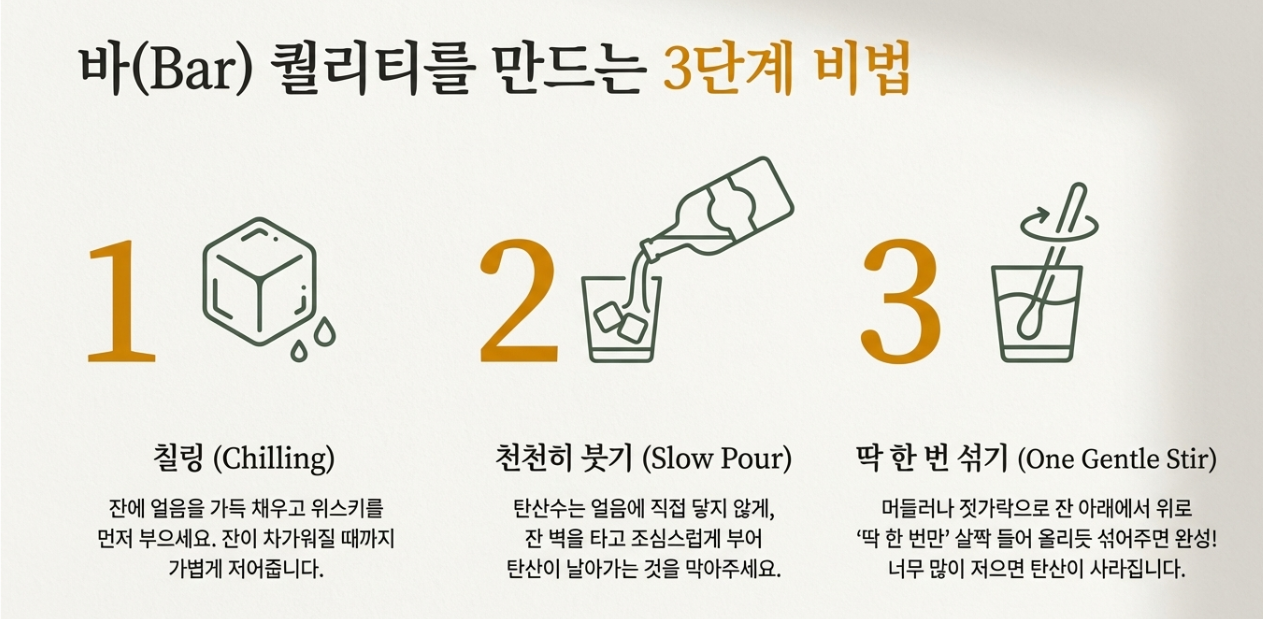 이 가격대 위스키들은 그냥 마셔도 좋지만, 탄산수와 섞어 '하이볼'로 마셨을 때 그 매력이 배가 되는 경우가 많아요. 특히 입문자분들이라면 너무 독하지 않게 비율을 맞추는 게 핵심이죠! 집에서도 바(Bar) 부럽지 않은 하이볼을 만드는 비법을 정리해 드릴게요.