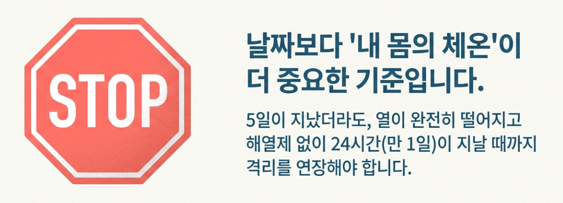 하지만 만약 금요일까지도 열이 난다면? 당연히 5일이 지났어도 열이 완전히 떨어지고 24시간이 지날 때까지 격리를 연장해야 합니다. 날짜보다 '내 몸의 체온'이 더 중요한 기준이라는 점을 꼭 기억해주세요!