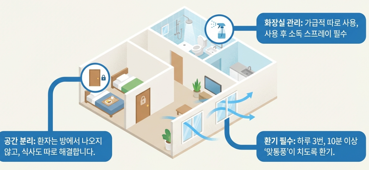 - 화장실 주의: 가능하다면 화장실을 따로 쓰고, 공용이라면 환자가 쓴 뒤 소독 스프레이를 뿌려주세요.